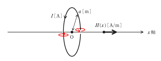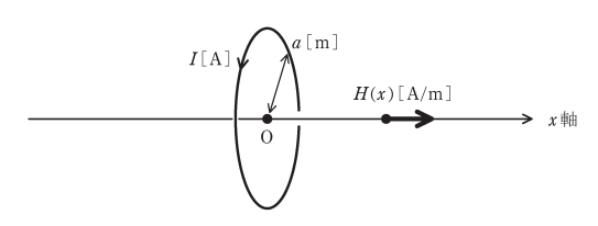 半径 $a$[m]の巻数 $N$ の円形コイルに電流 $I$[A]を流したときの中心の磁界の強さ $H$[A/m]は