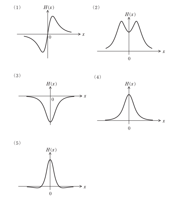 図のように、原点 O を中心とし $x$ 軸を中心軸とする半径 $a$ [m]の円形導体ループに直流電流 $I$ [A]を図の向きに流したとき、$x$ 軸上の点、つまり、$(x、y、z)=(x、0、0)$ に生じる磁界の $x$ 方向成分 $H(x)$ [A/m]を表すグラフとして、最も適切なものを次の(1)~(5)のうちから一つ選べ。