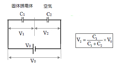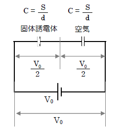 固体誘電体部分の静電容量と、空気部分の静電容量は同じですので、かかる電圧も同じになります。