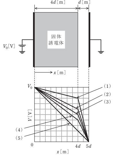 つまり、固体誘電体と空気部分の境界の電圧は $\displaystyle\frac{V_o}{2}$ となり、極板間の電位分布を表すグラフでは (3) が該当します。