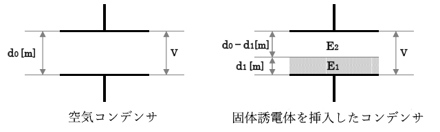 空気コンデンサと、固体誘電体を挿入したコンデンサの図を示します。