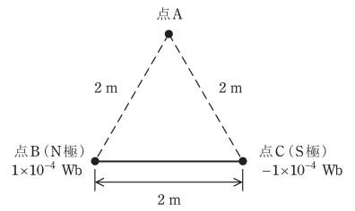 ただし、点 A、B、C は、一辺を 2m とする正三角形の各頂点に位置し、真空中にあるものとする。真空の透磁率は $μ0=4π×10^{-7}$ H/mとする。また、N極、S極の各点磁荷以外の部分から点 A への影響はないものとする。