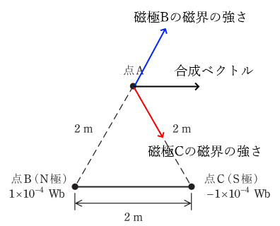 磁極Bにより点Aに発生する磁界の強さと、磁極Cにより点Aに発生する磁界の強さ、合成磁界の強さをベクトル図で示します。