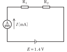 Ra、Rb 及び Rc の三つの抵抗器がある。これら三つの抵抗器から二つの抵抗器( R1 及び R2 )を選び、図のように、直流電流計及び電圧 $E=1.4$Vの直流電源を接続し、次のような実験を行った。